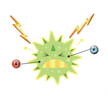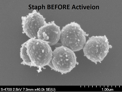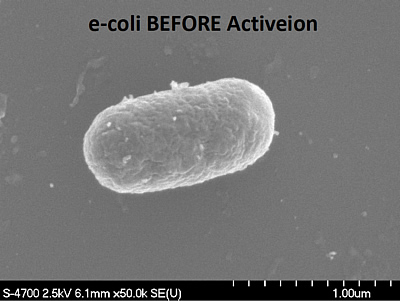 Effektive Wirksamkeit der Reinigung mit dem ionatorEXP™ Sekunden danach: Hier handelt es sich um eine 50.000fache Vergrösserung durch ein SEM (scanning electron microscope) die jeweils ein e-coli btw. Stabh Zellenaufnahme vor und nach dem Gebrauch des ionators EXP™ zeigt. |