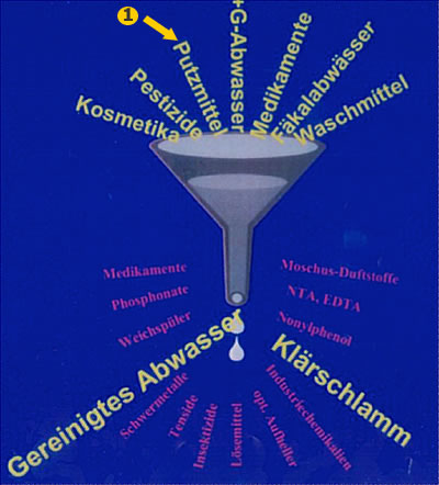 Folgende Abbildung zeigt die verschiedenartigsten anorganischen Verunreinigungen, welche unsere Kläranlagen nicht mehr genügend gut herausfiltrieren können und dadurch (rot) wieder in die Abwässer weiter fliessen! |